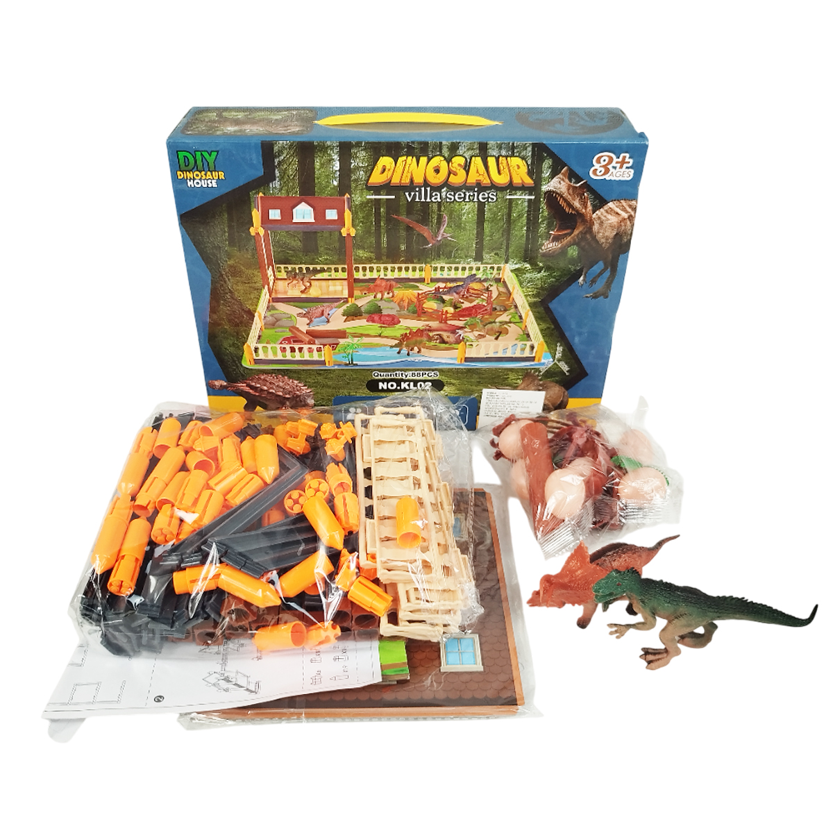 Set de construcción de juguetes de la Villa de dinosaurios el set incluye 152 pzs para contruir casa y un entorno de dinosaurios, dimendiones de 56 x 80 x 15 cm